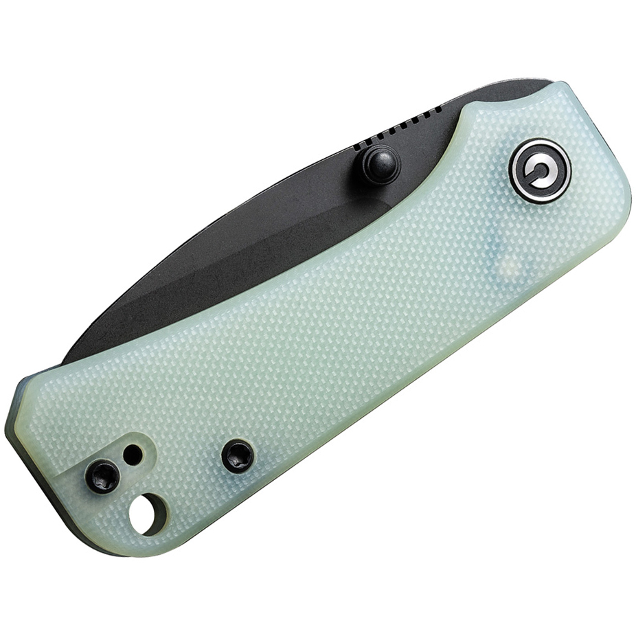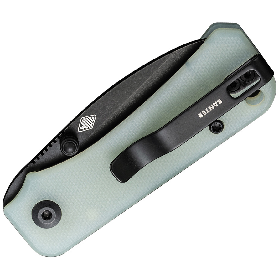 The handle of the Baby Banter is made from G10 material, providing a comfortable and secure grip. The handle is finished in jade G10, adding a touch of sophistication to the knife. The stainless steel liners are also black, complementing the overall design.