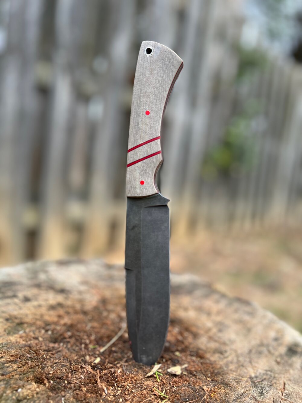 (Delorean G10 Handles with Red Liners and Spacers and 5.75″8670 Carbon Steel Double Edged Black Stonewashed Blade)