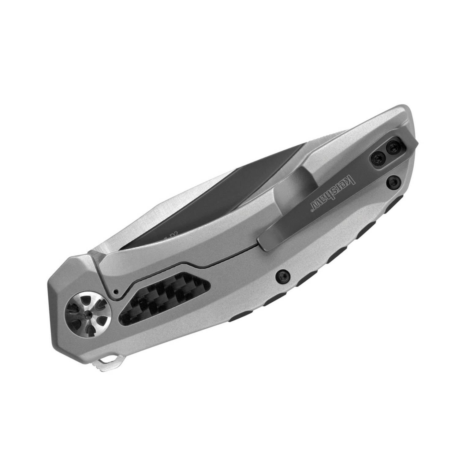 Inspired by the lines of aerospace design, the Norad has landed. The Norad opens with Kershaw’s KVT ball-bearing system and a flipper. But we reduced the size of the flipper when the knife is closed—and made it disappear altogether when the knife is open. Carbon fiber inserts in the steel handle and an oversized, polished pivot add a modern look, while a custom backspacer with raised jimping provides a secure grip. The big, beefy drop-point blade has a two-toned finish: a hollow in the blade features gray PVD coating and the rest of the blade is machine satin finished.