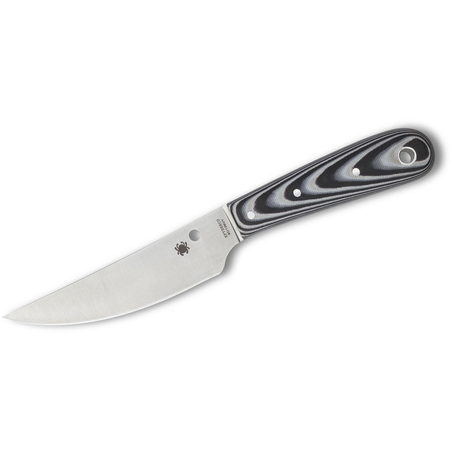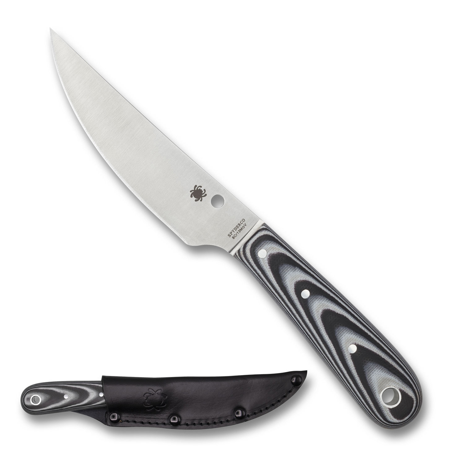 Custom knifemaker Phil Wilson is an avid hunter and fisherman who incorporates his extensive outdoor experience into every one of his designs. That insight makes his knives the cutting tools of choice of savvy outdoorsmen worldwide and makes him one of Spyderco’s most popular collaborators. The Spyderco Bow River faith- fully captures the spirit and detail of Wilson’s custom creation and delivers it in a package specifically geared toward budget-conscious adventurers. This compact, all-purpose design features a full-flat-ground, trailing-point blade crafted from 8Cr13MoV stainless steel. The blade is paired with a contoured, ergonomic, full- tang handle with layered black and gray G-10 scales. Offering exceptional design and performance at an affordable price, the Bow River comes complete with a high-quality leather pouch-style sheath.