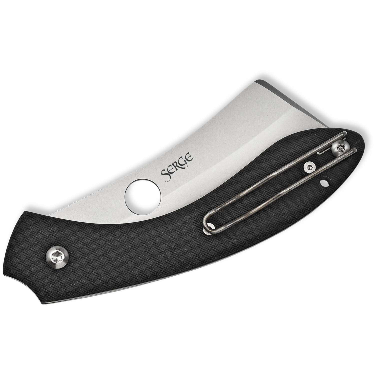 Designed by Ukrainian-born custom knifemaker Serge Panchenko, the Roc combines a dramatic cleaver-style blade with a gracefully curved handle. Its bead-blasted VG-10 stainless steel blade is saber ground for strength and locks via a sturdy Walker LinerLock mechanism. The knife’s easily cleaned open-backed handle features skeletonized full stainless steel liners and peel-ply-textured black G-10 scales. To keep it poised for instant access, the Roc includes a reversible deep-pocket wire clip configurable for left or right-side tip-up carry.