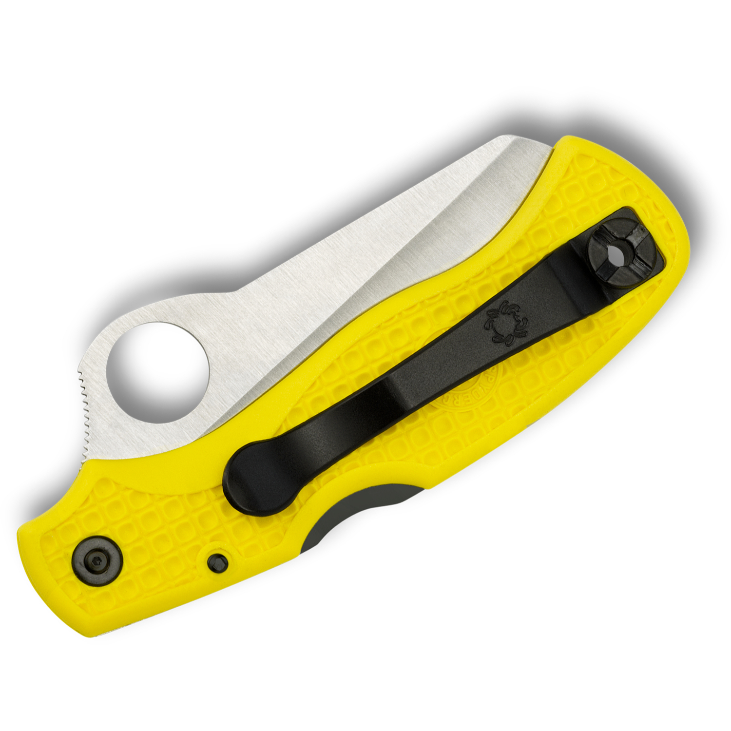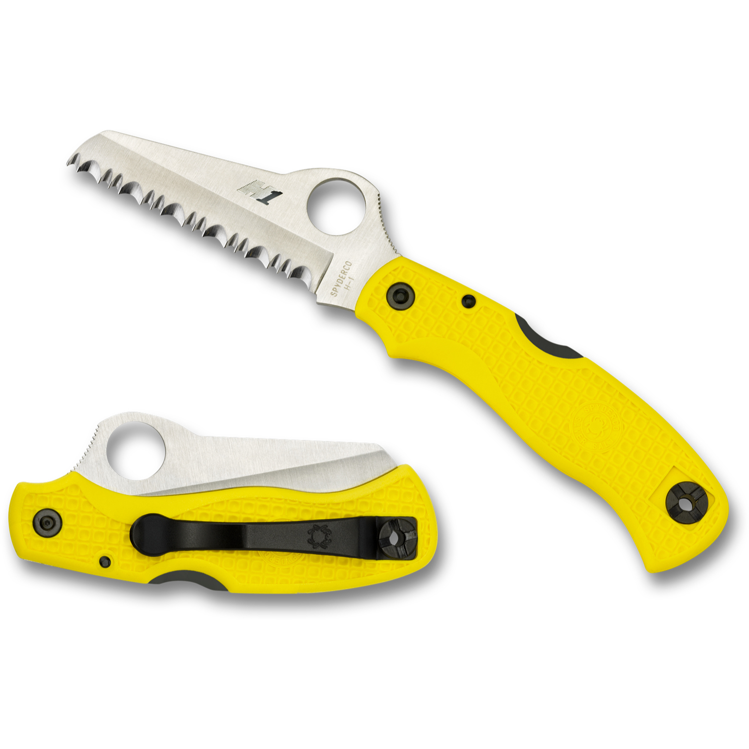 Spyderco’s Rescue knives are long favored by seafarers and the design has since been embraced by rescue workers, EMT’s and ranchers-anyone cutting around flesh in an emergency. Now available in an ultra-corrosion-resistant version, the Saver Salt is a modified Rescue made with state of the art H1 steel.nThe oversized 14mm Spyderco Round Hole works for opening/closing even if hands are gloved, cold or wet. Available in marine yellow, the fiberglass reinforced nylon resin the handle comes textured with a grip-sticking waffle pattern. An ambidextrous tip-up pocket clip also houses a lanyard hole for a variety of carry possibilities.